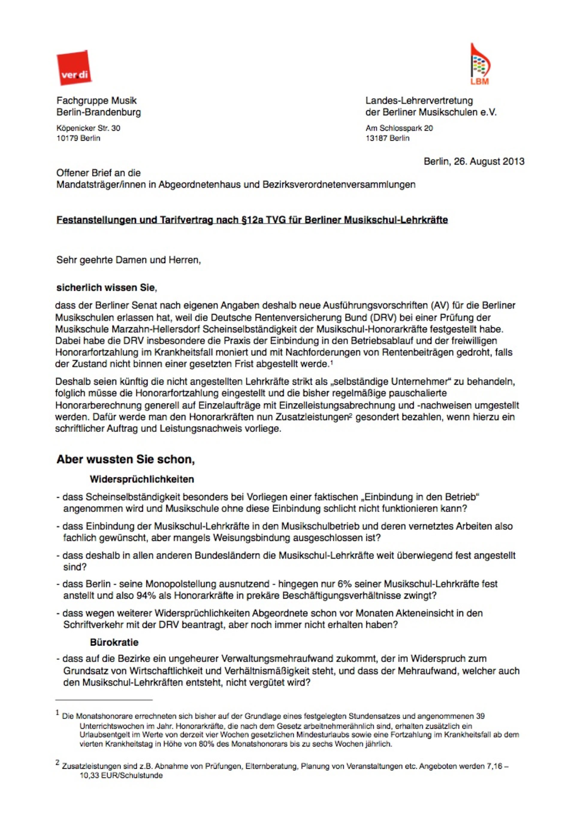 Angesichts der sich weiter verschärfenden Lage unserer Musikschulen haben sich die FG Musik der ver.di und die LBM in einem gemeinsamen offenen Brief an alle Mandatsträger im Berliner Abgeordnetenhaus und in den Bezirksverordnetenversammlungen gewandt.
