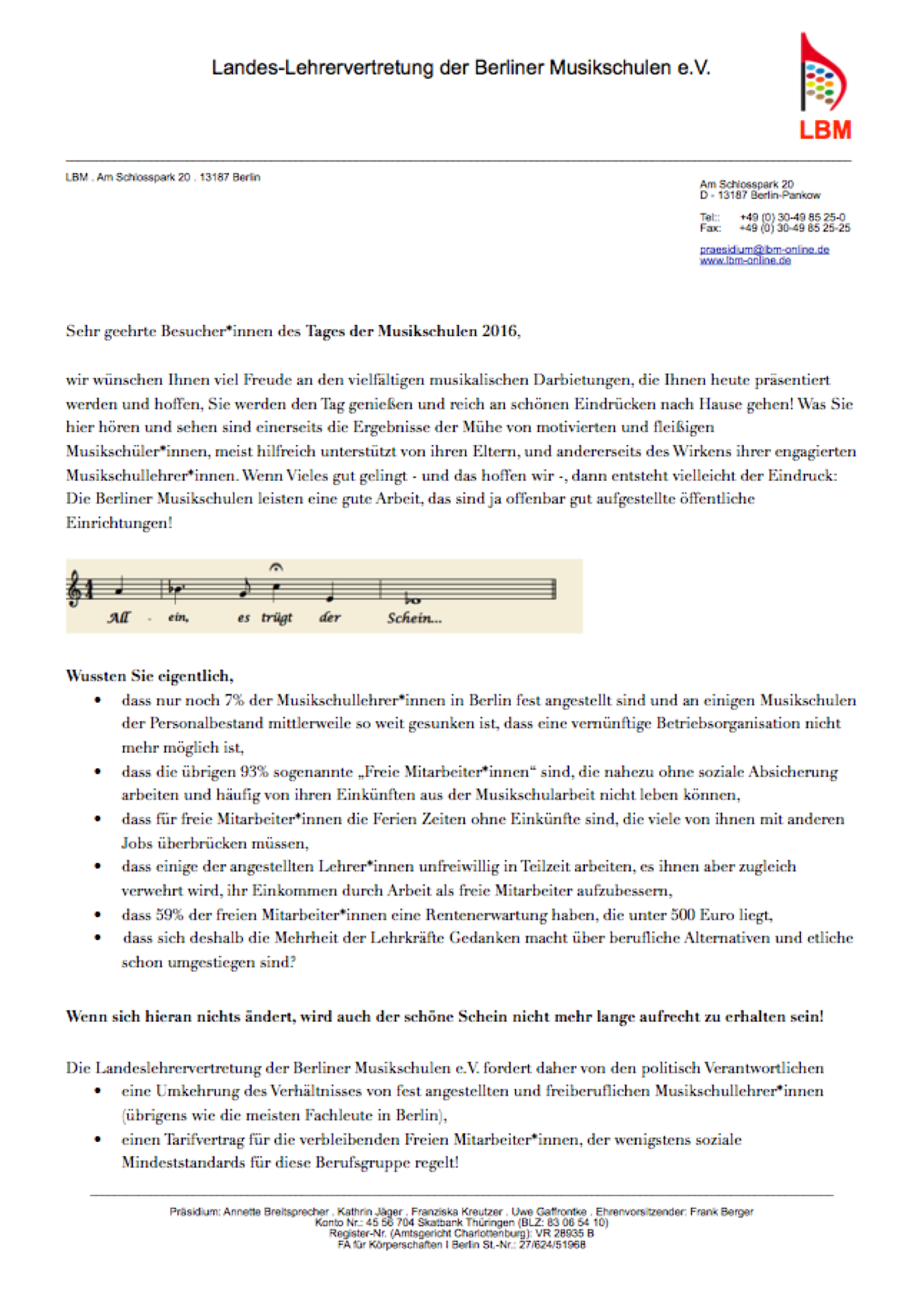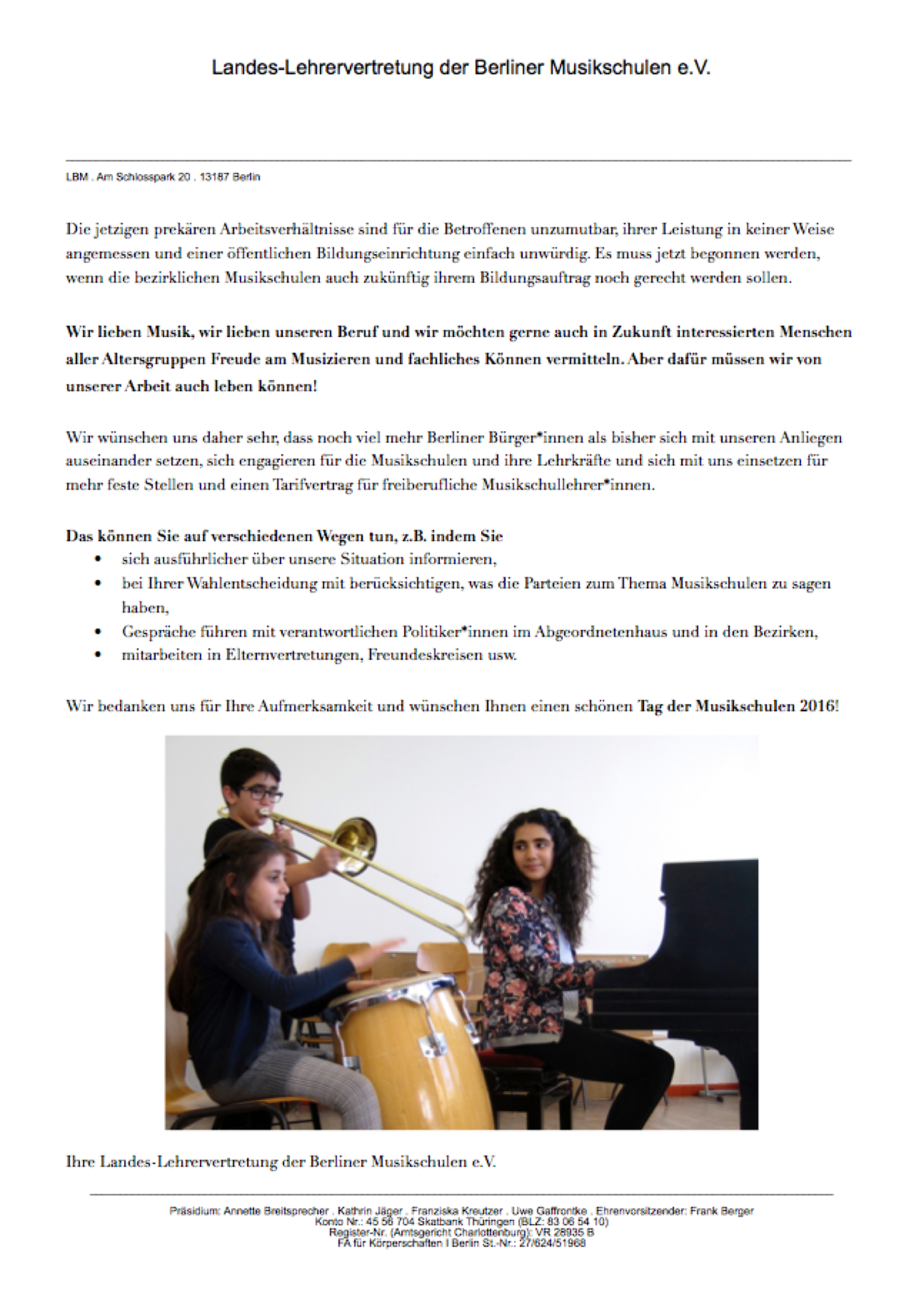 Zum diesjährigen „Tag der Berliner Musikschulen 2016“ in der Berliner Philharmonie hat die LBM ein Info-Blatt veröffentlicht, das interessierten Besuchern übergeben werden soll.